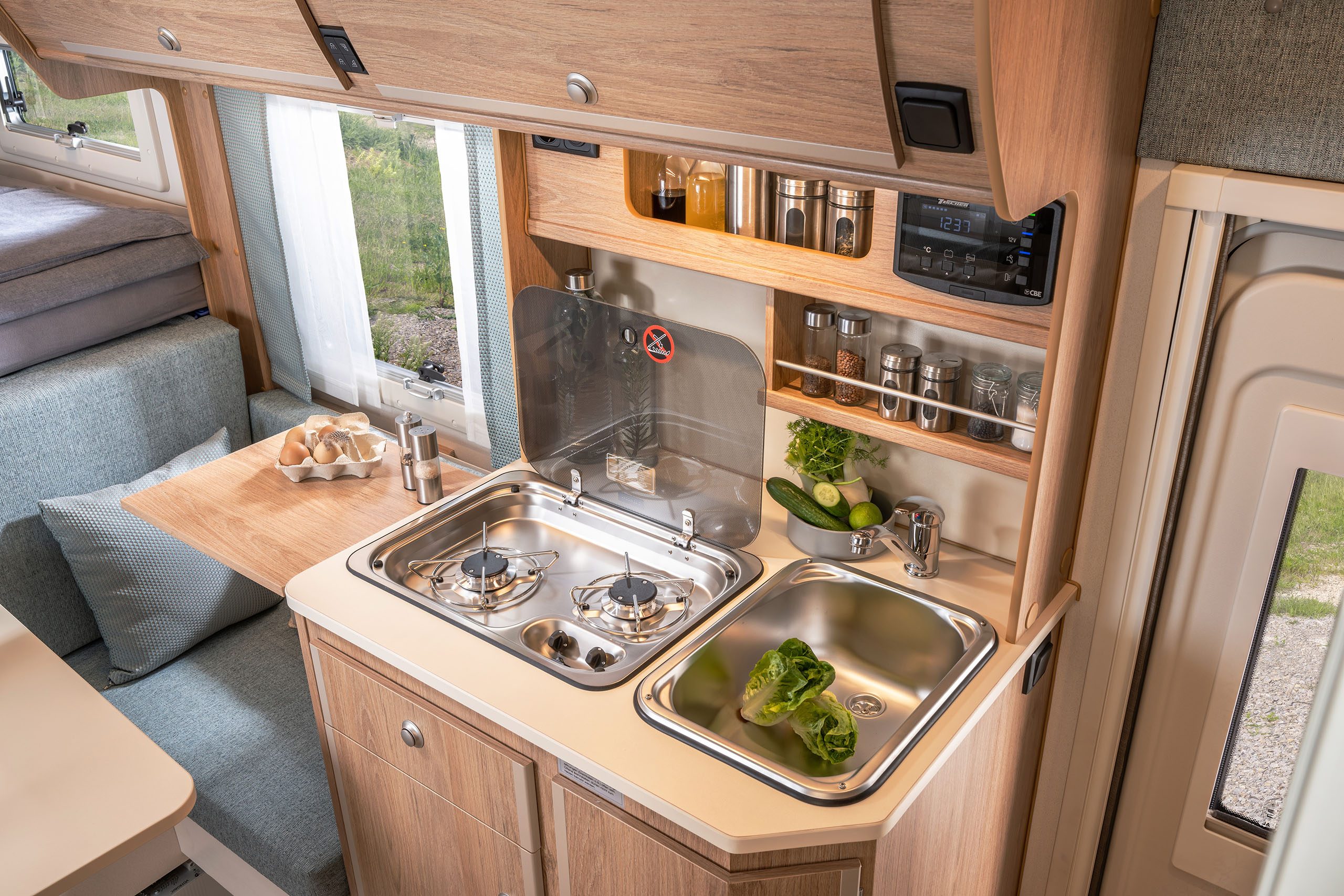Clever durchdacht wie ein Sterne-Menü: Unsere Kabinen-Küche ist funktional, ergonomisch gestaltet und perfekt an das Leben unterwegs angepasst.